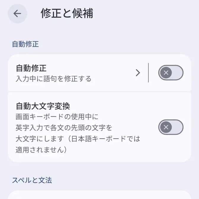 設定の修正と候補より自動大文字変換をオフに切り替えます(画像はオフの状態)。