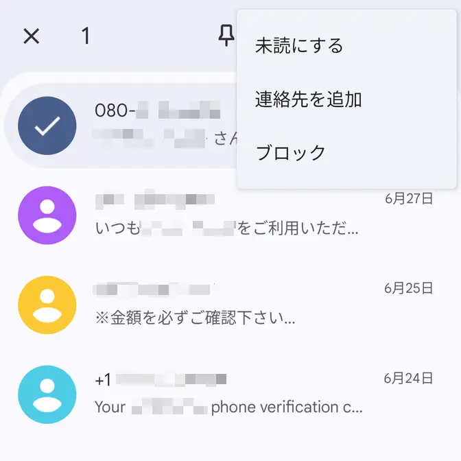 Androidアプリ→Googleメッセージ→スパム/ブロック中Androidアプリ→Googleメッセージ→スパム/ブロック中→メッセージ