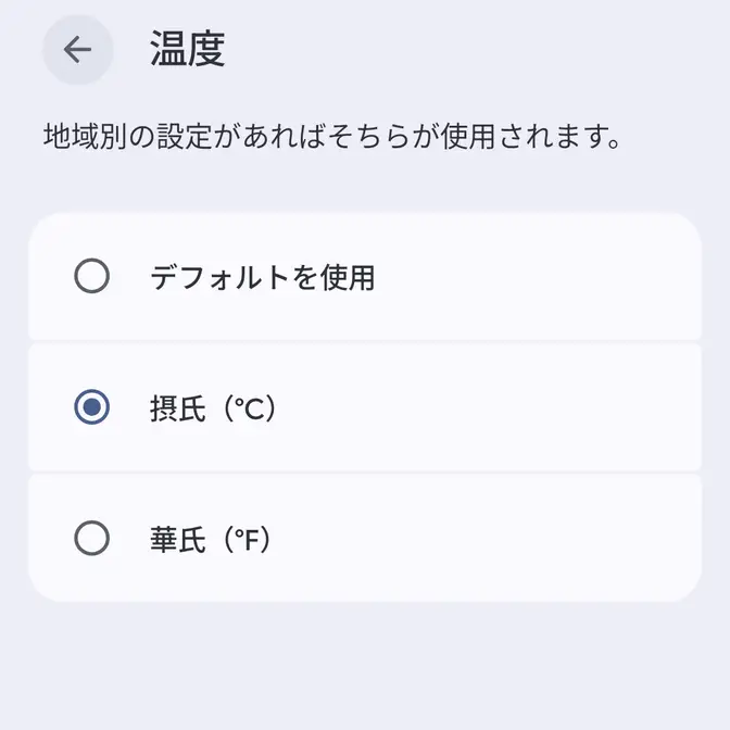 ただ、これはアプリの設定がデフォルトを使用するようになっているからであり、摂氏(℃)/華氏(℉)を選択すれば言語にかかわらず表示を固定できるので、英語で摂氏(℃)を表示することも可能です。