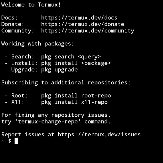 Termuxのパッケージ管理マネージャーはpkgコマンドが備わっているので、以下のコマンドを実行してパッケージを最新にアップグレードします。