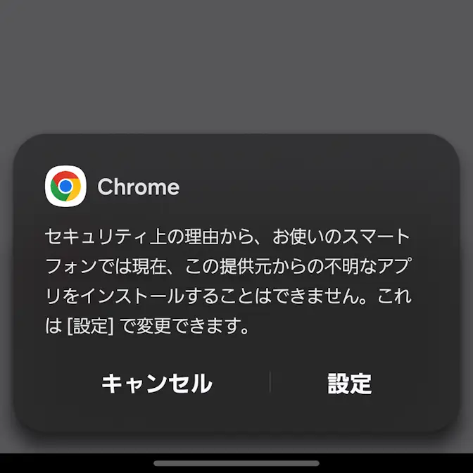 ダウンロードが完了したら開くをタップし、セキュリティ上の理由から~と表示されたら設定をタップします。