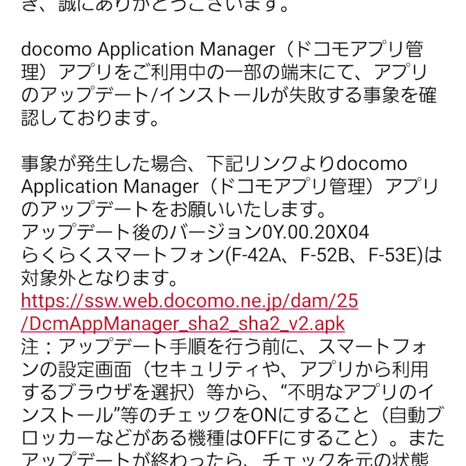ドコモスマートフォンの[ドコモアプリ管理]において【アプリダウンロードが失敗する場合の対処】と言うお知らせがあることに気が付きました。どうやらdocomo Application Managerを手動で更新する必要があるようです。