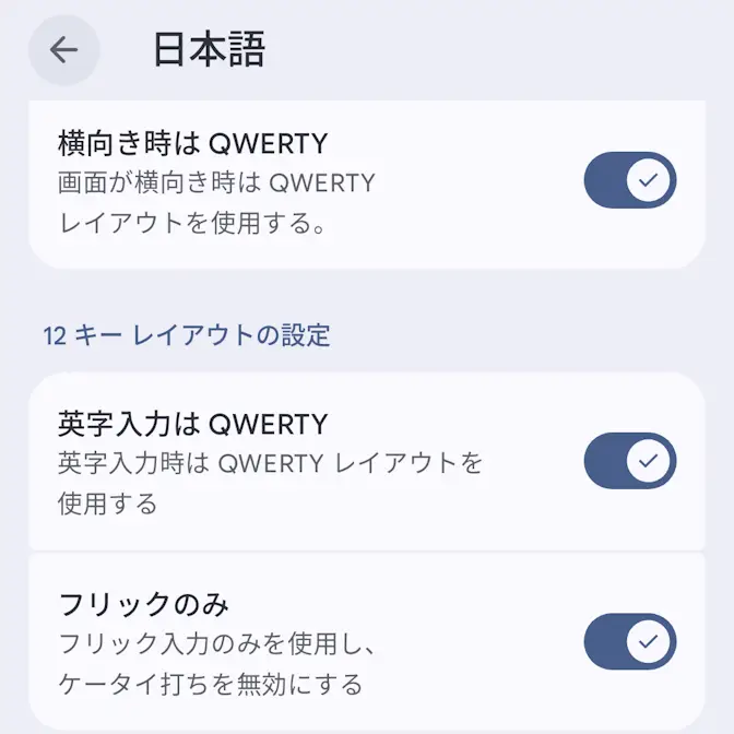 これは意外と面倒な操作ですが、Google PixelシリーズなどにプリインストールされたGboardアプリでは、設定で“フリック入力のみ”をオンにすることでトグル入力がオフにすることができます。