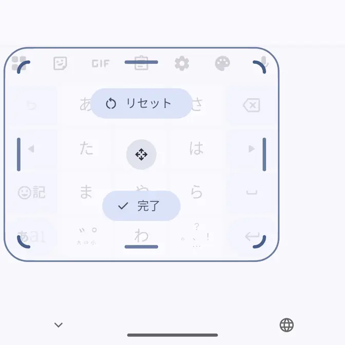 キーボードより以下のアイコンをタップし、枠をタップしたまま動かしてサイズと位置を自由に変更したら完了をタップします。
