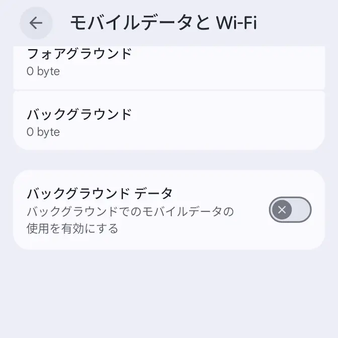 アプリ情報のモバイルデータ使用量よりバックグラウンドデータをタップしてオフに切り替えます(画像はオフの状態)。