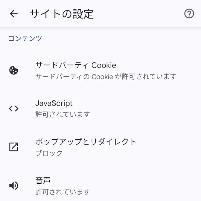 Androidアプリ→Chromeブラウザ→設定Androidアプリ→Chromeブラウザ→設定→サイトの設定