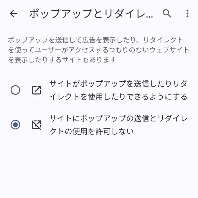 Androidアプリ→Chromeブラウザ→設定→サイトの設定→ポップアップとリダイレクト→サイトにポップアップの送信とリダイレクトの使用を許可しない