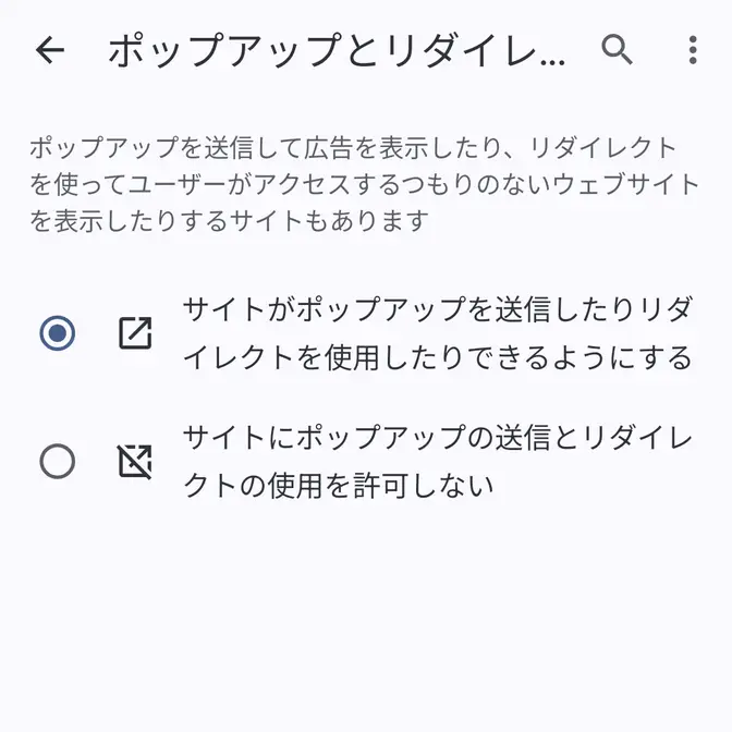 Androidアプリ→Chromeブラウザ→設定→サイトの設定→ポップアップとリダイレクトAndroidアプリ→Chromeブラウザ→設定→サイトの設定→ポップアップとリダイレクト→許可されています→メニュー