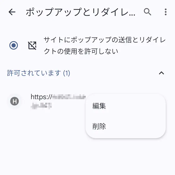 ポップアップとリダイレクトの許可されていますより、対象Webサイトの>削除をタップします。