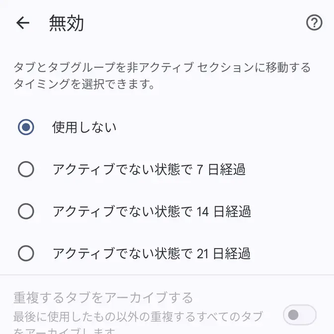 AndroidスマートフォンのChromeブラウザでは、7日後/14日後/21日後にタブを無効にすることができるようになっており、無効になったタブはアクティブでないタブにまとめられるため簡単に復元できますが、無効にしたくない場合は使用しないを選択すれば勝手に無効になることはありません。