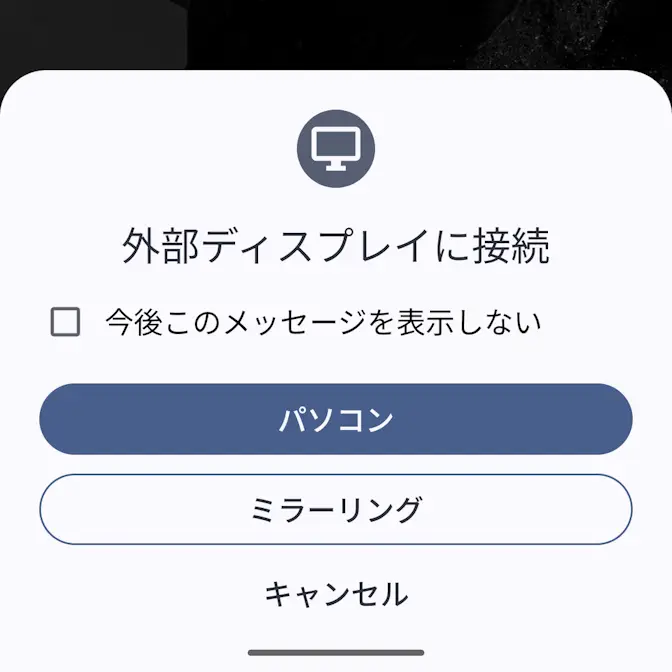 画面に外部ディスプレイに接続と表示された場合はパソコンをタップします。