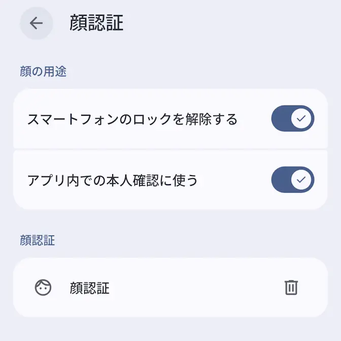 終了後、設定の顔認証より目を開いているか確認/常に確認が必要/ロック画面をスキップなどの選択や顔モデルの削除の操作ができるようになります。