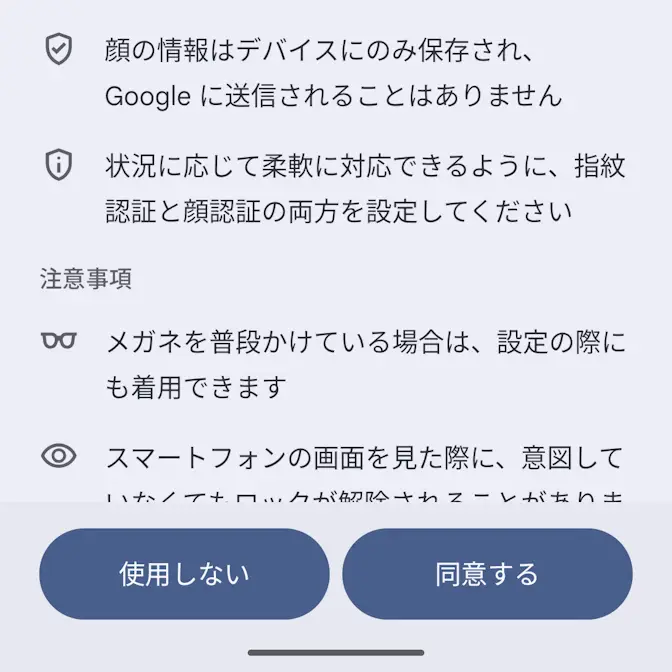 デバイスのロック解除の顔認証>顔認証の設定より同意するをタップします。
