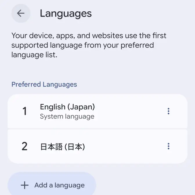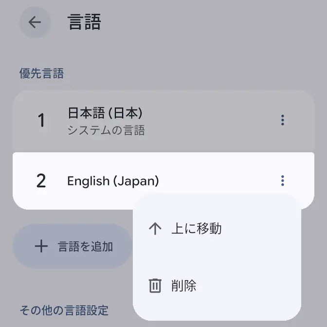 追加された言語の︙より上に移動をタップして一番上に移動します。