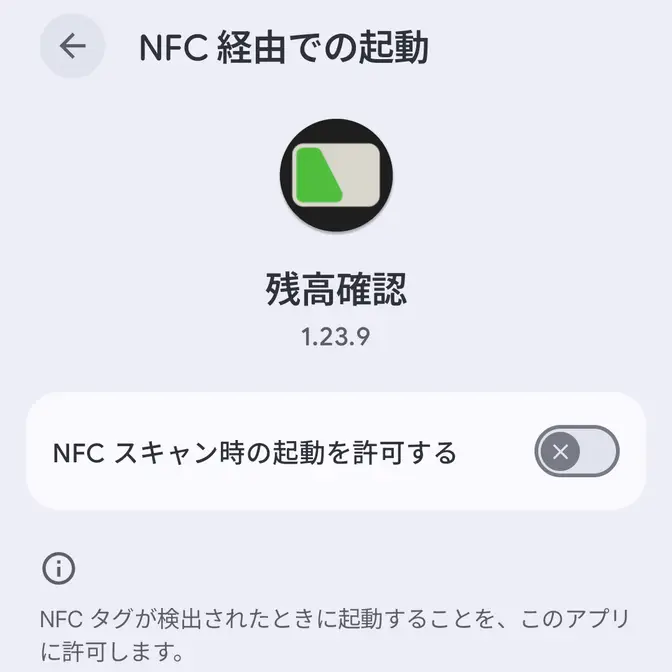 アプリによって異なりますが、例えばGoogle Playでダウンロード&インストールできる電子マネーICカード残高確認アプリを例とすると、>未起動時にカードを読み取るをオフに切り替えれば起動しなくなります。