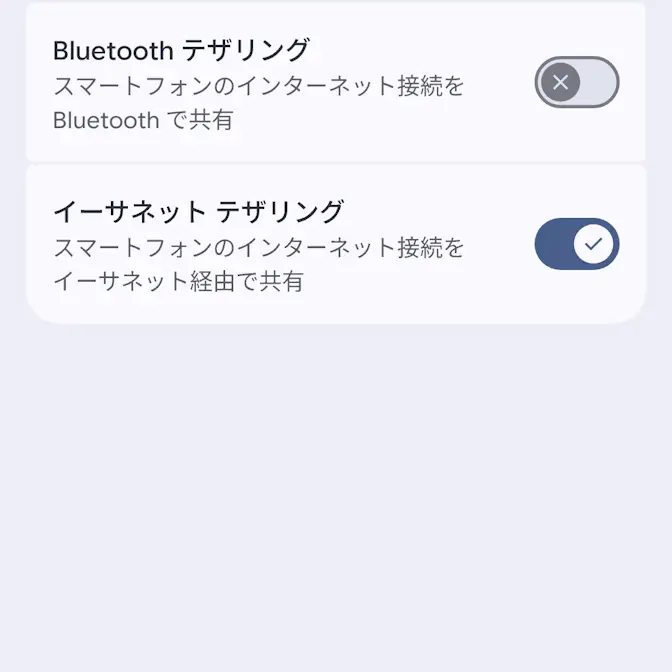 アクセスポイントとテザリングよりイーサネットテザリングオンに切り替えます。