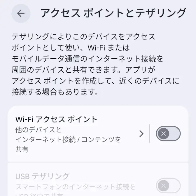 スマートフォンをアクセスポイント(親機)としてパソコンタブレットゲーム機などをインターネットに接続するための機能をテザリングと呼びます。