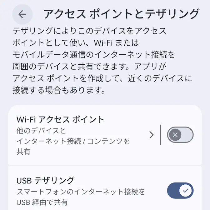 アクセスポイントとテザリングよりUSBテザリングをオンに切り替えます。