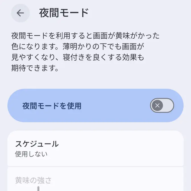 寝る前などにスマートフォンを閲覧すると「画面の色が黄色い」と感じるのは、夜間モードが有効になっていることがほとんどで、これは寝つきを良くする効果があると言われています。