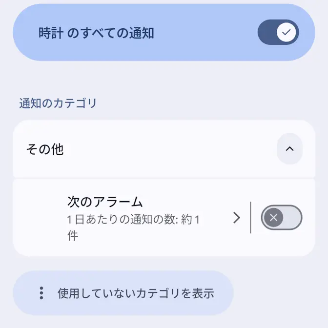 アプリ情報の通知よりその他>次のアラームをオフに切り替えます(画像はオフの状態)。