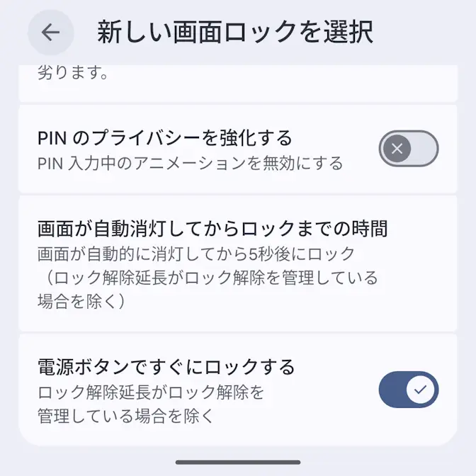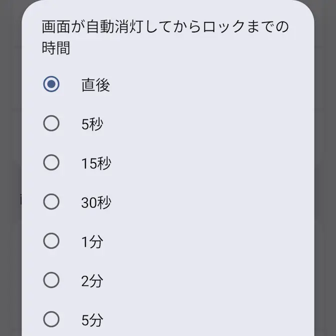 このため、スリープと同時に画面ロックするには電源ボタンですぐにロックする>オン画面が自動消灯してからロックまでの時間>直後を選択します。