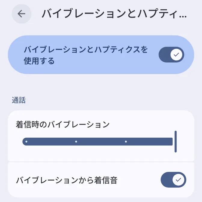 Androidスマートフォン→音とバイブレーション→バイブレーションとハプティクス