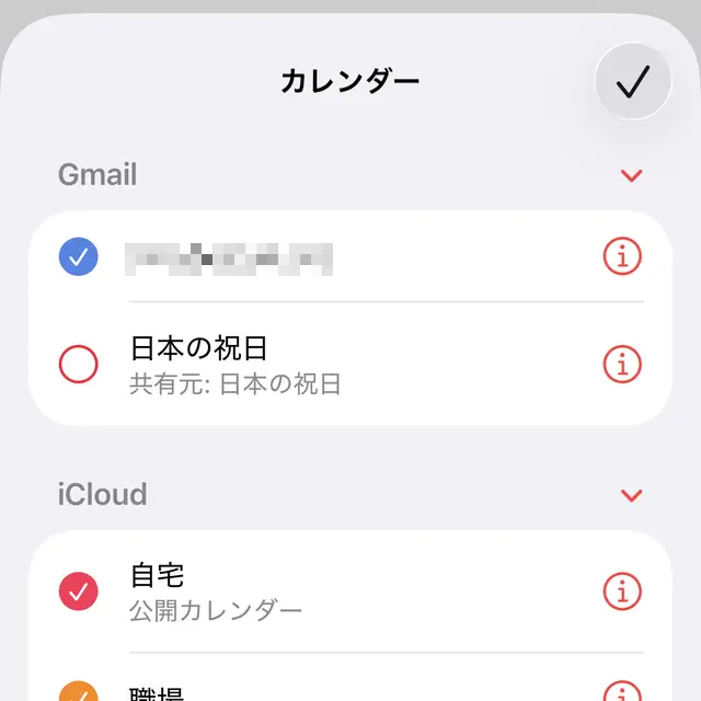 カレンダーアプリよりカレンダーのアイコンをタップし、一覧より表示したいカレンダーをチェックします。