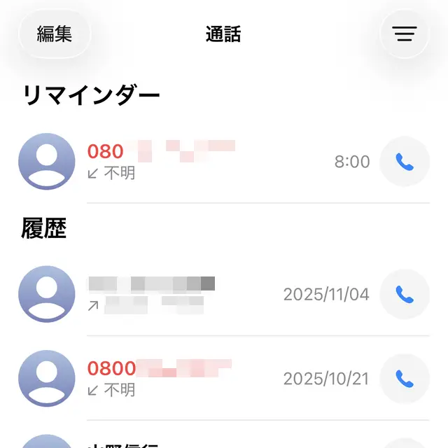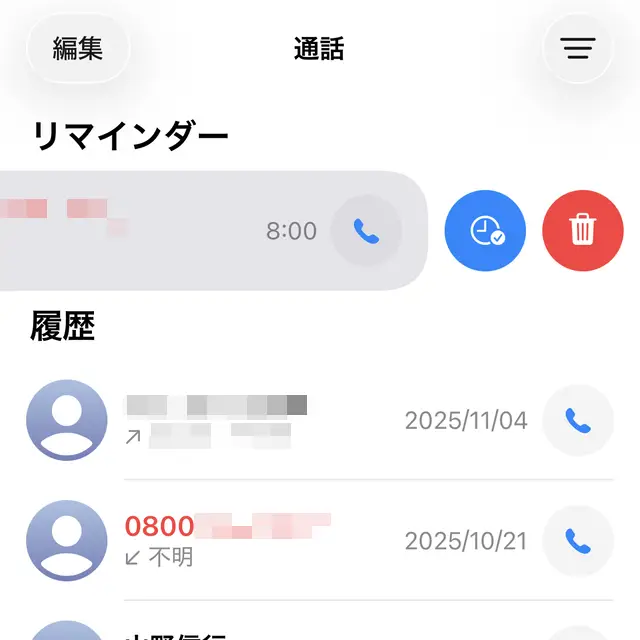 電話アプリの通話に追加されたリマインダーより(編集)/(削除)できます。