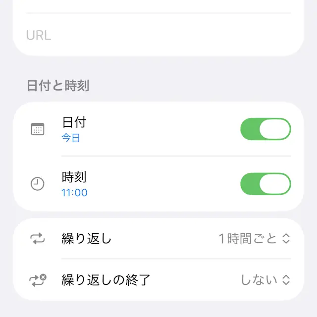 これをiPhoneでもできないものかと最初はショートカットアプリを使ってみましたが、「1時間ごと」と言うトリガーが簡単では無く複雑だったので、次にリマインダーアプリを試したところ簡単に時報を実現できました。