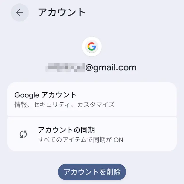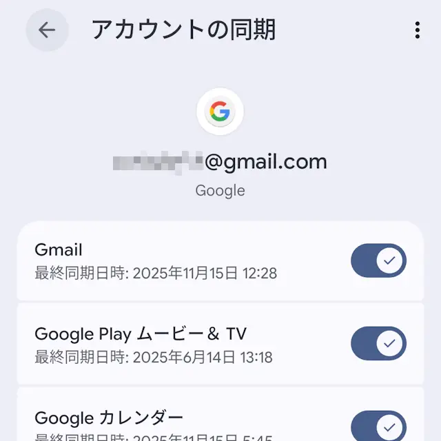 同期する項目は、設定のパスワードとアカウント>(対象のGoogleアカウント)>アカウントの同期よりオン/オフを切り替えます。