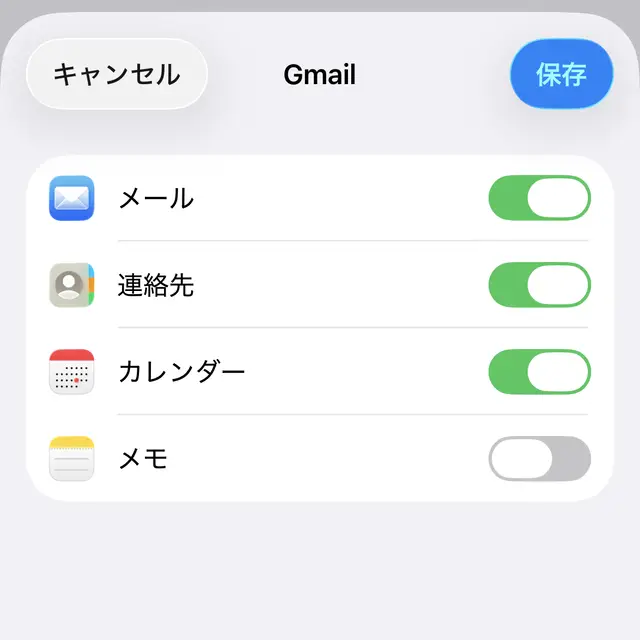 - Gmailよりメール/連絡先/カレンダーをタップしてオン/オフを切り替え保存をタップします。