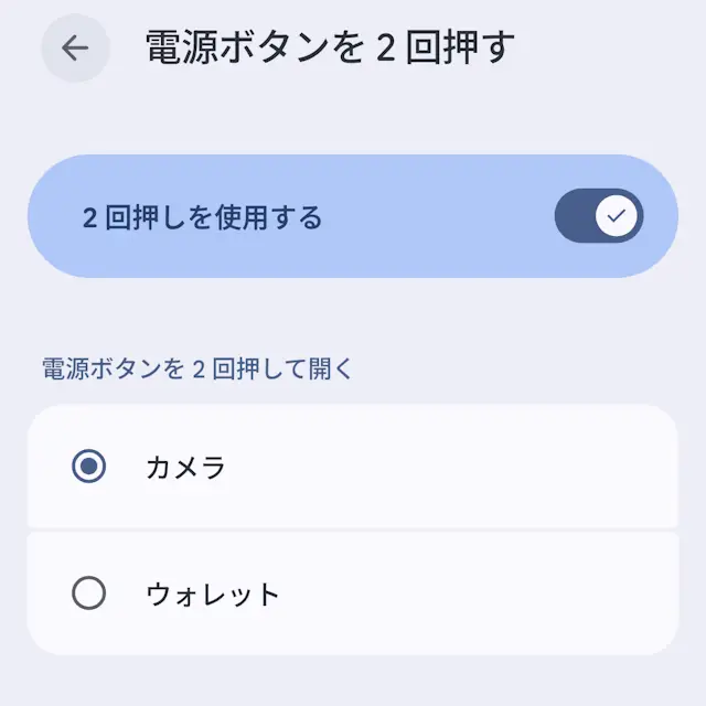 ジェスチャーの電源ボタンを2回押すより2回押しを使用するをオンに切り替えカメラを選択します。