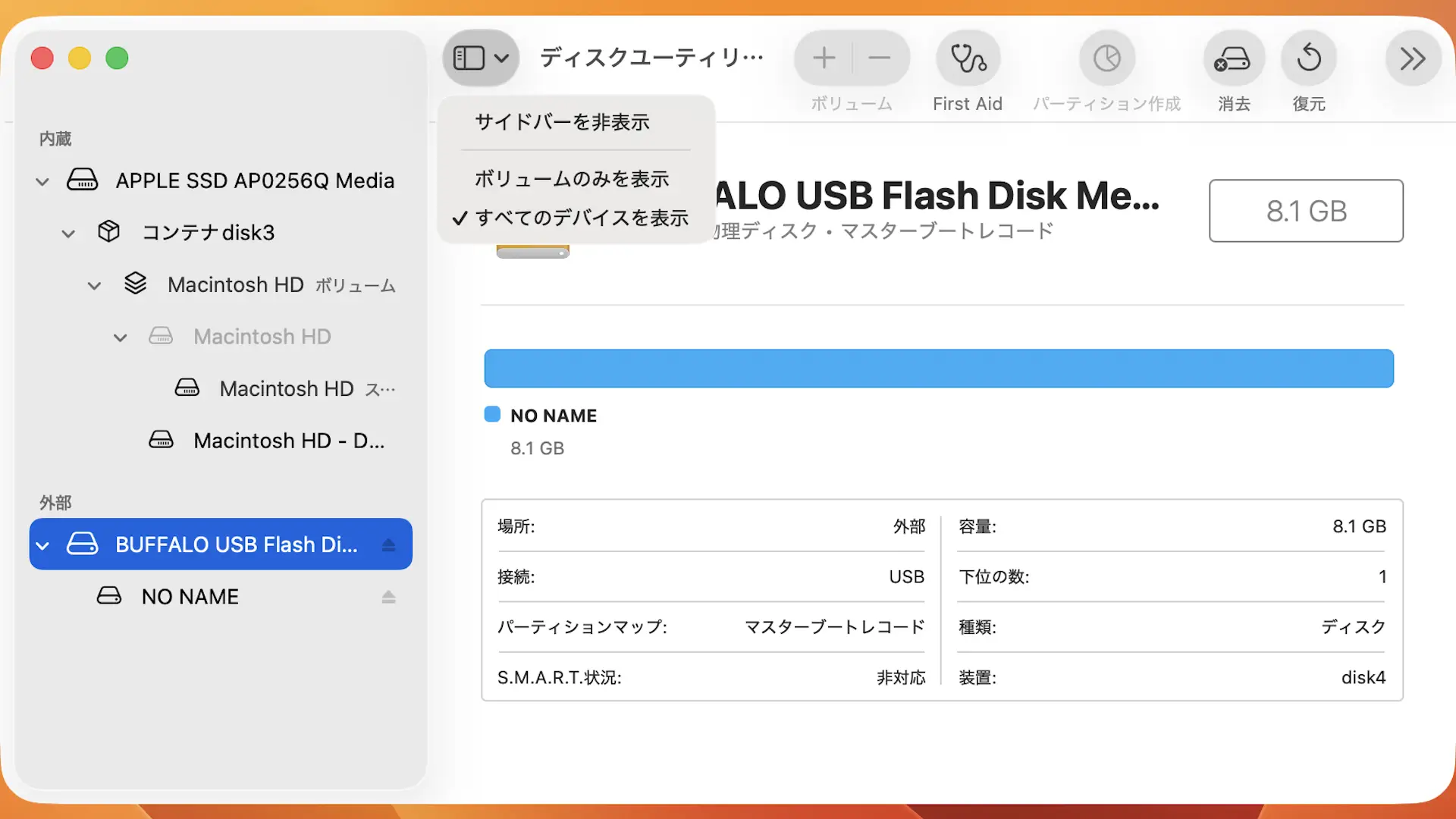 ディスクユーティリティのよりすべてのデバイスを表示をクリックします。