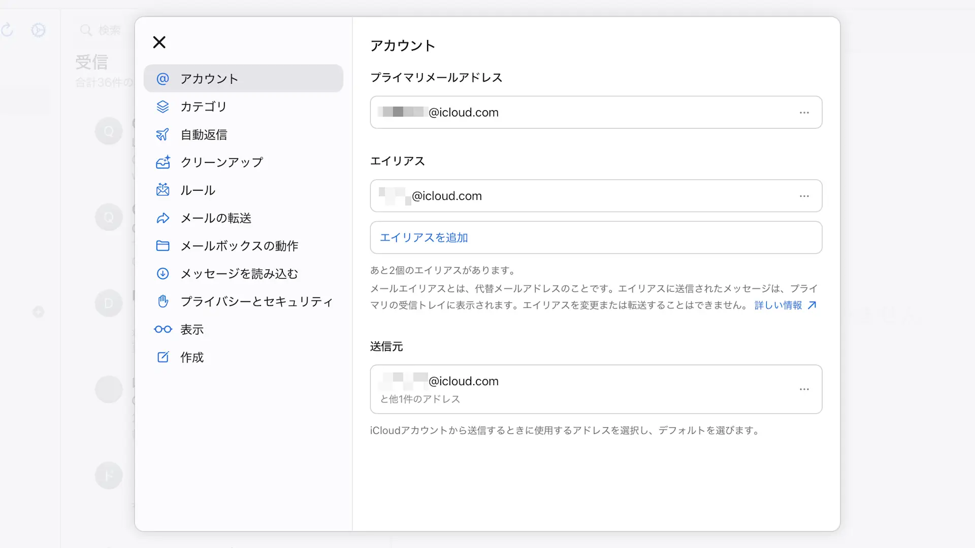 Macのメールアプリもメールアプリの設定より変更できるようになっていますが、“@icloud.com”のメールアドレスに関してはWebブラウザでicloud.comが表示され、そこから変更するようになっています。