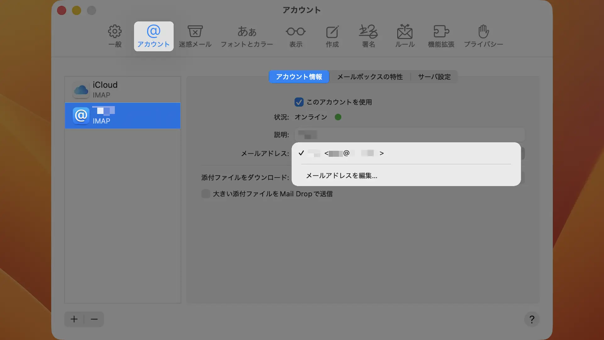 Macのメールアプリから送信するEメールの【差出人名】を変更する場合はメールアプリから変更できますが、プリセットされた“@icloud.com”と後から追加した別のメールアドレスではやり方が異なります。