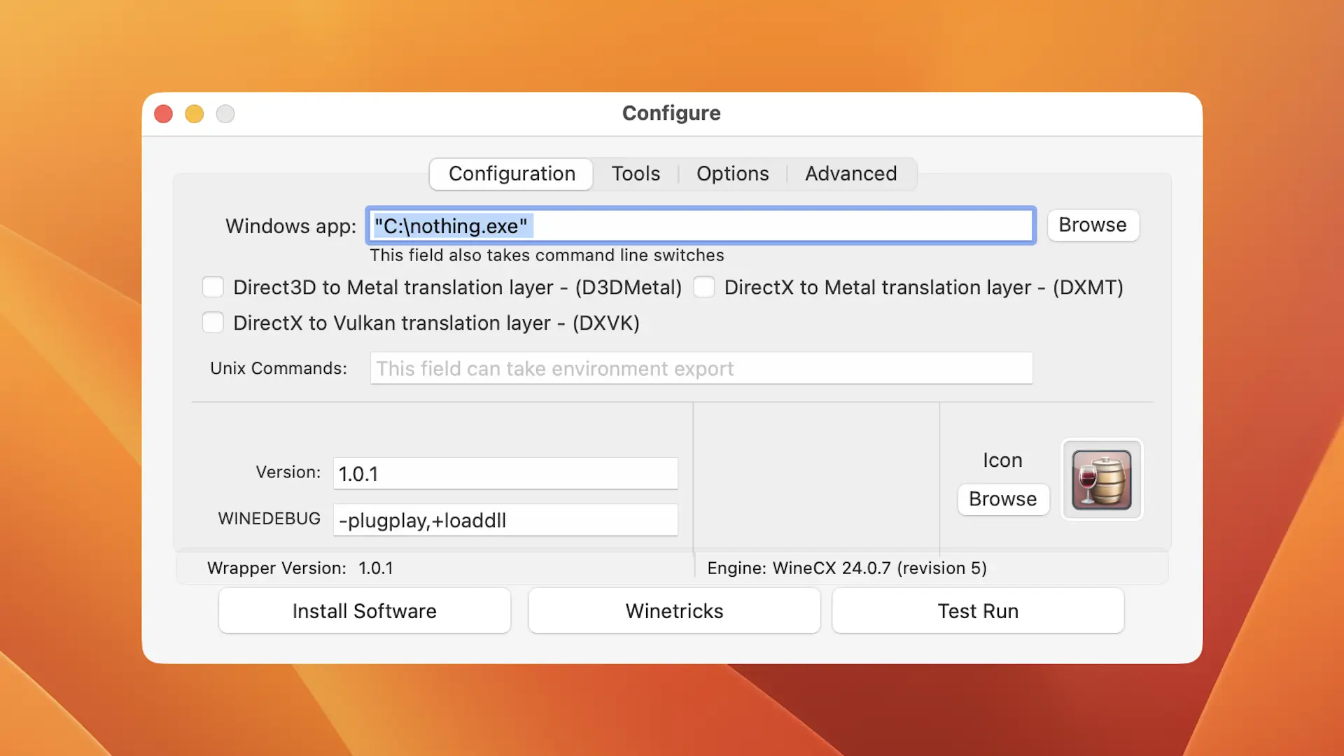 brew install --cask --no-quarantine Sikarugir-App/sikarugir/sikarugir