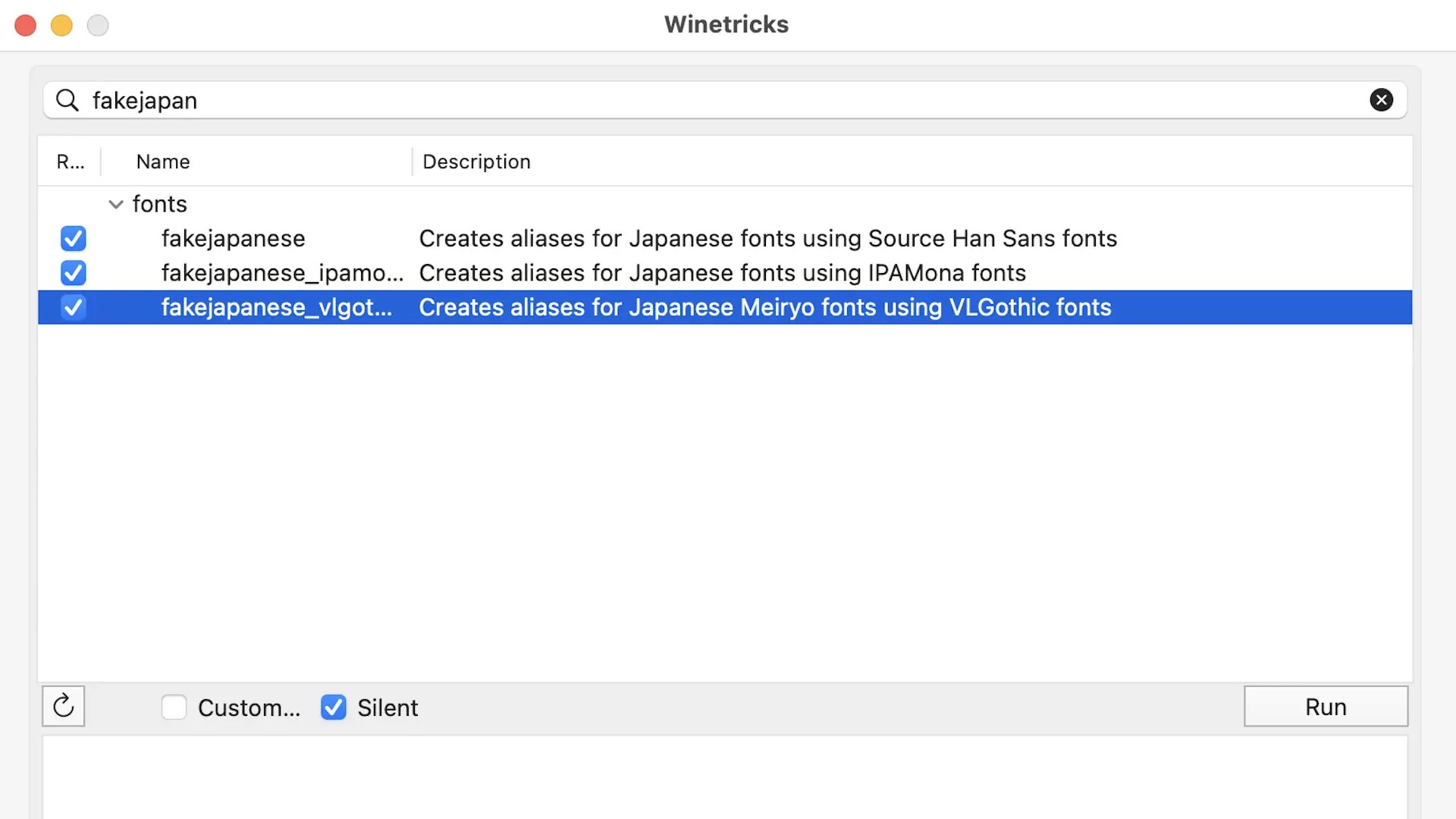 Winetricksよりfakejapanを検索し(日本語フォント)を選択したうえでRun>Yesを押下します。