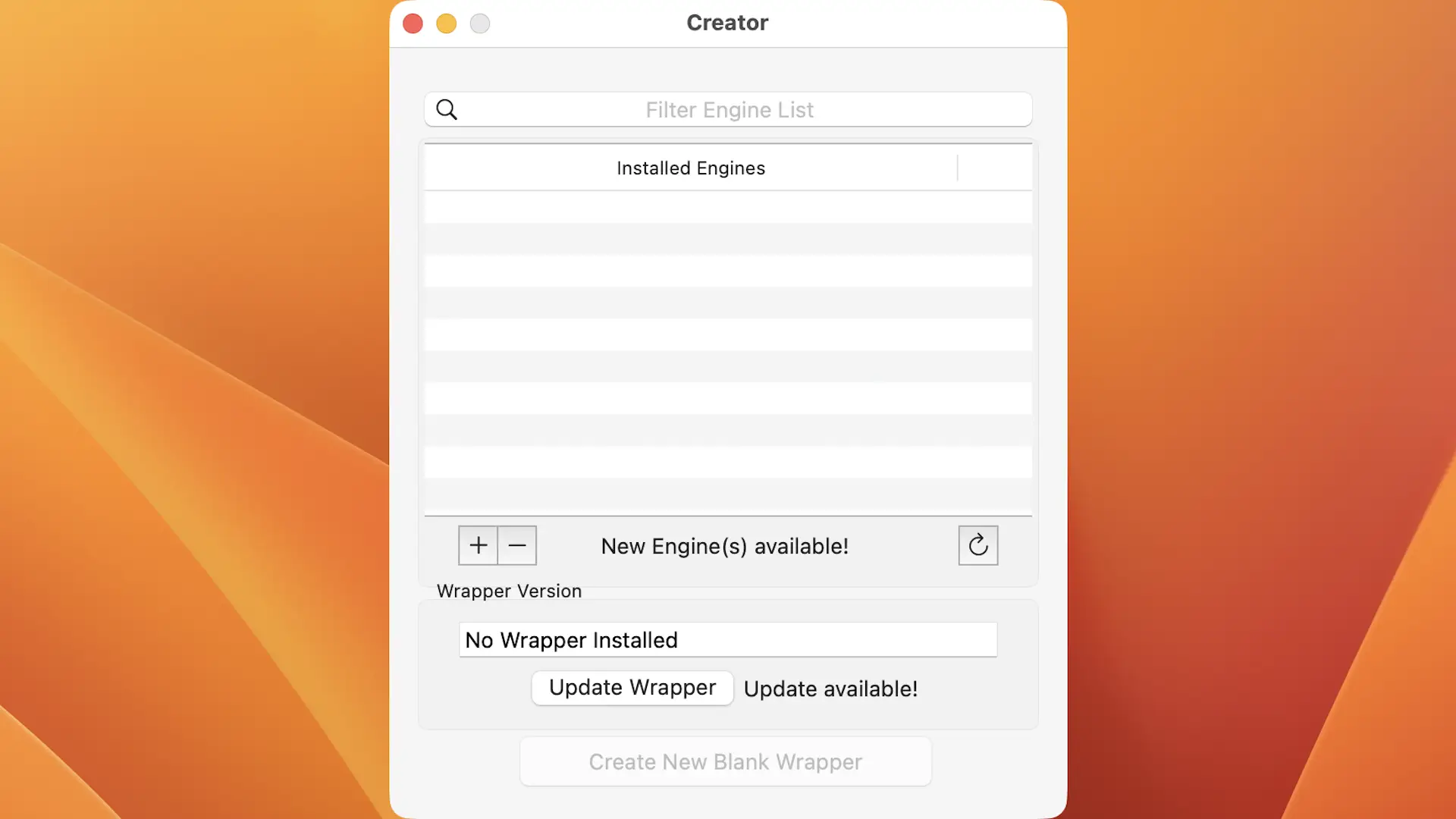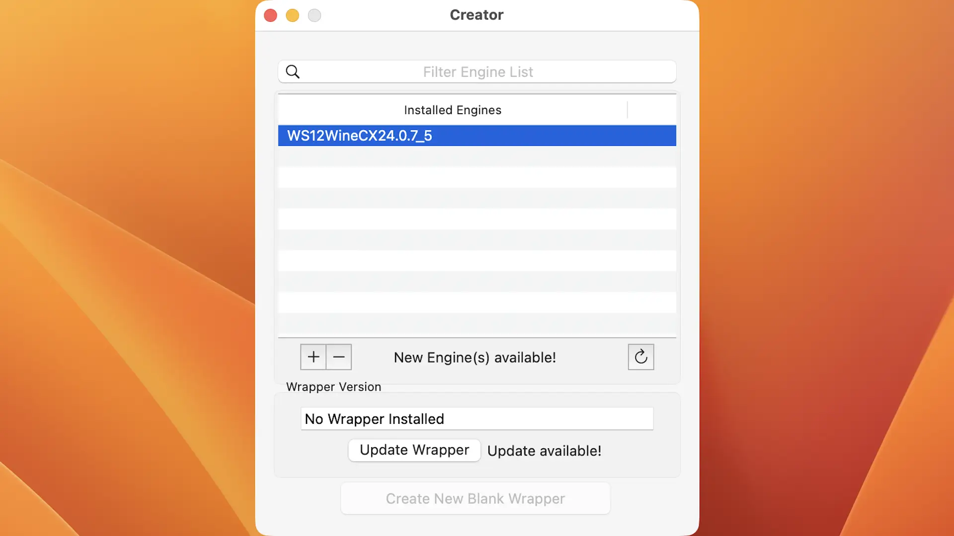 FinderのアプリケーションよりSikarugir Creatorを実行し、CreatorのInstalled Enginesより+をクリックします。