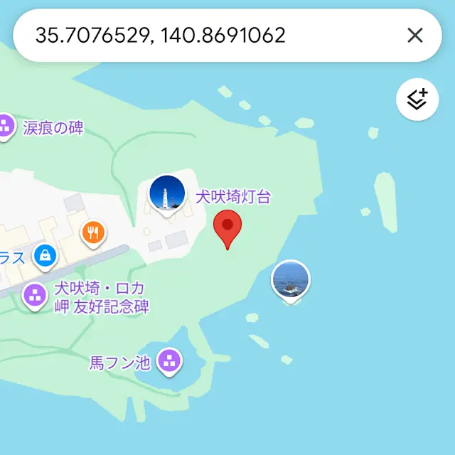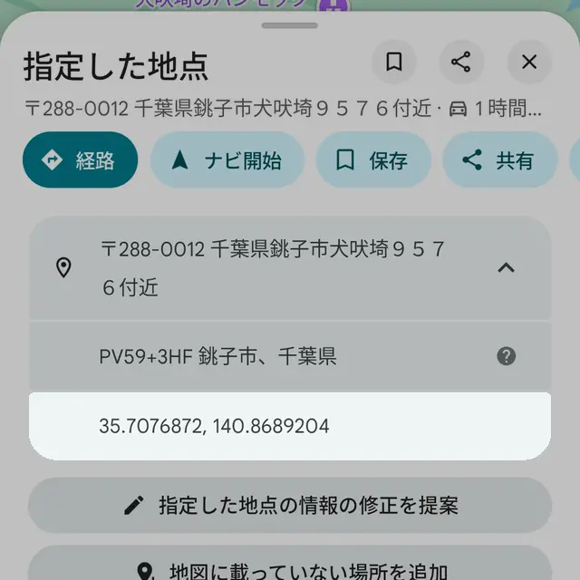 住所や名前が表示される場所では緯度・経度が表示できないので、可能な限り道路や何も無い場所を長押しします。