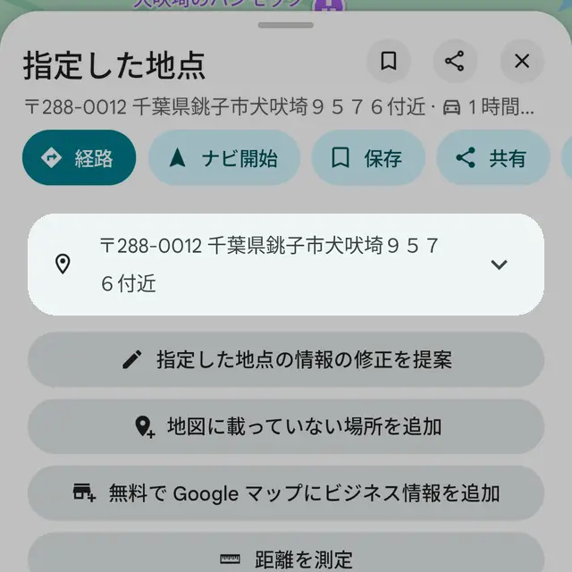 住所や名前が表示される場所では表示されないことがあるので、可能な限り道路や何も無い場所を長押しします。