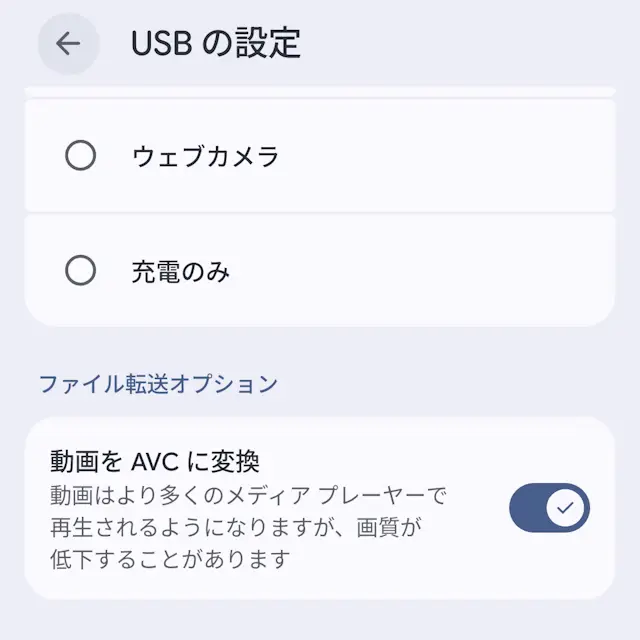 USBの設定よりファイル転送/Android Autoを選択し、必要に応じて動画をAVCに変換をオンに切り替えます。