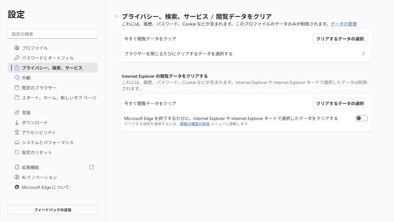 Microsoft Edgeは設定より手動で削除するのはもちろん、ブラウザを閉じるたびに自動で削除することもできます。