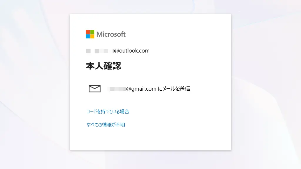 しかし、Microsoftアカウントの場合には手順が異なり、登録済みメールアドレスを入力する>セキュリティコードがメールに届く>セキュリティーコードを入力するとなります。