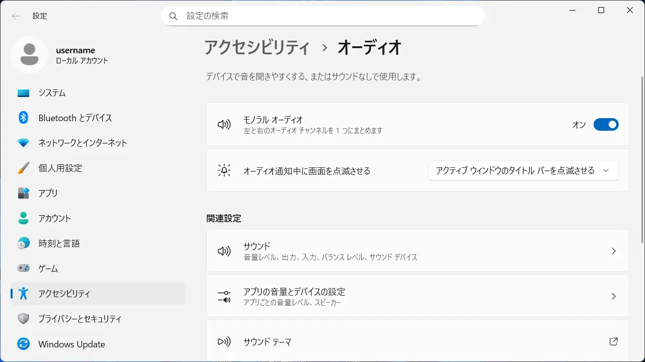 Windows 11→設定→アクセシビリティ→オーディオ