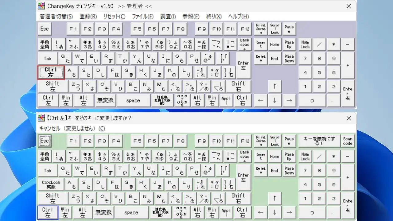 ChangeKeyよりCapsLockをクリックし、新しく表示されたキーボードより左下のCtrl左をクリックします。