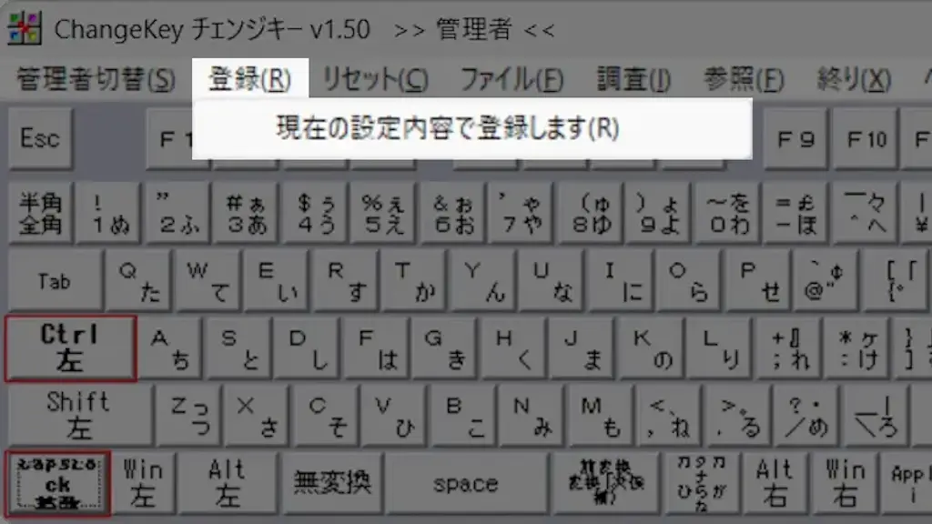 ChangeKeyより左下のCtrl左をクリックし、新しく表示されたキーボードよりCapsLockをクリックします。