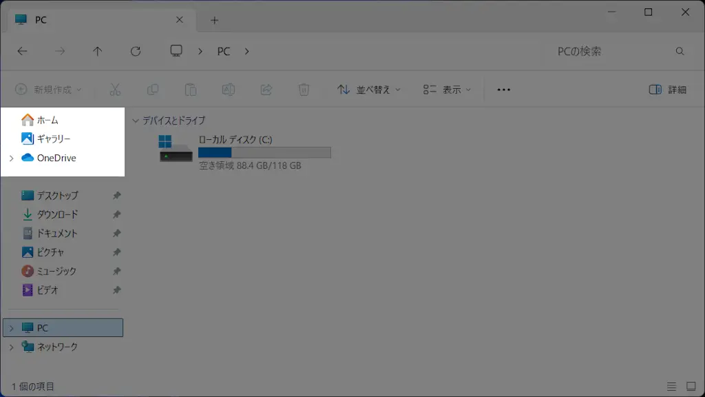 ナビゲーションウィンドウの上部に表示される項目のうちホーム/ギャラリー/OneDriveはレジストリを操作することで非表示にできます。