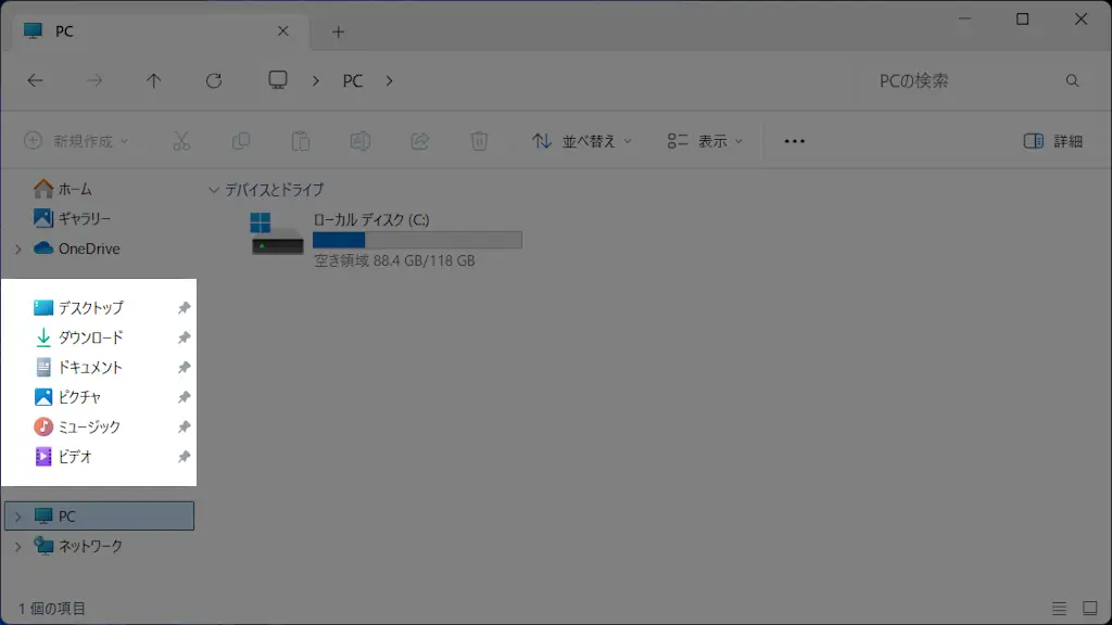 デフォルトで表示されている項目のうち、デスクトップ/ダウンロード/ドキュメント/ピクチャ/ミュージック/ビデオなどはクイックアクセスであり、任意に追加/削除が可能です。