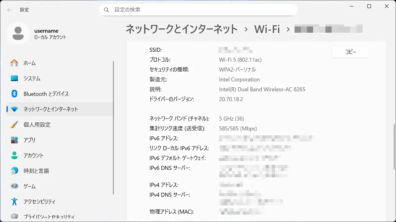 Windows 11→設定→ネットワークとインターネット→ネットワークの詳細設定→Wi-Fi
