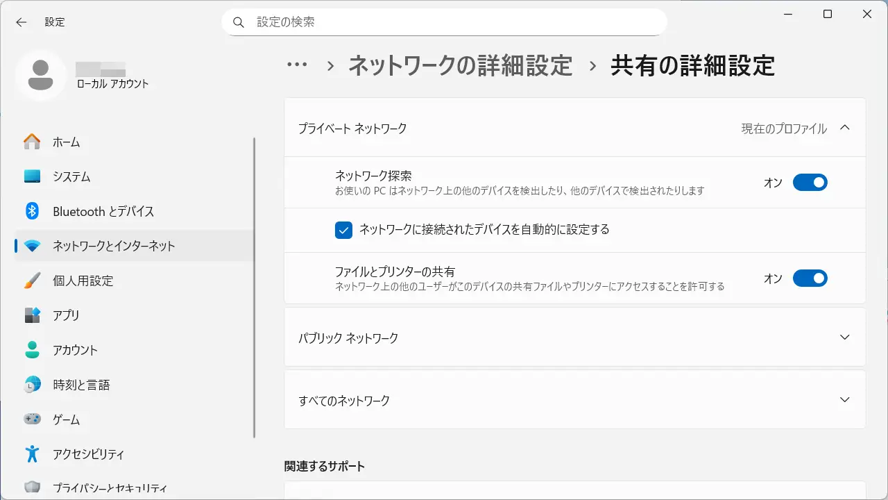 したがって、有効に切り替えれば良いですが、有効にすると他のパソコンからファイルなどが閲覧/操作できる場合があり、Windows 11のデフォルトで公共の場での使用が想定されているパブリックネットワークでは非推奨です。